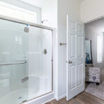- Fiberglass Shower Stall with Glass Enclosure in Master Bathroom