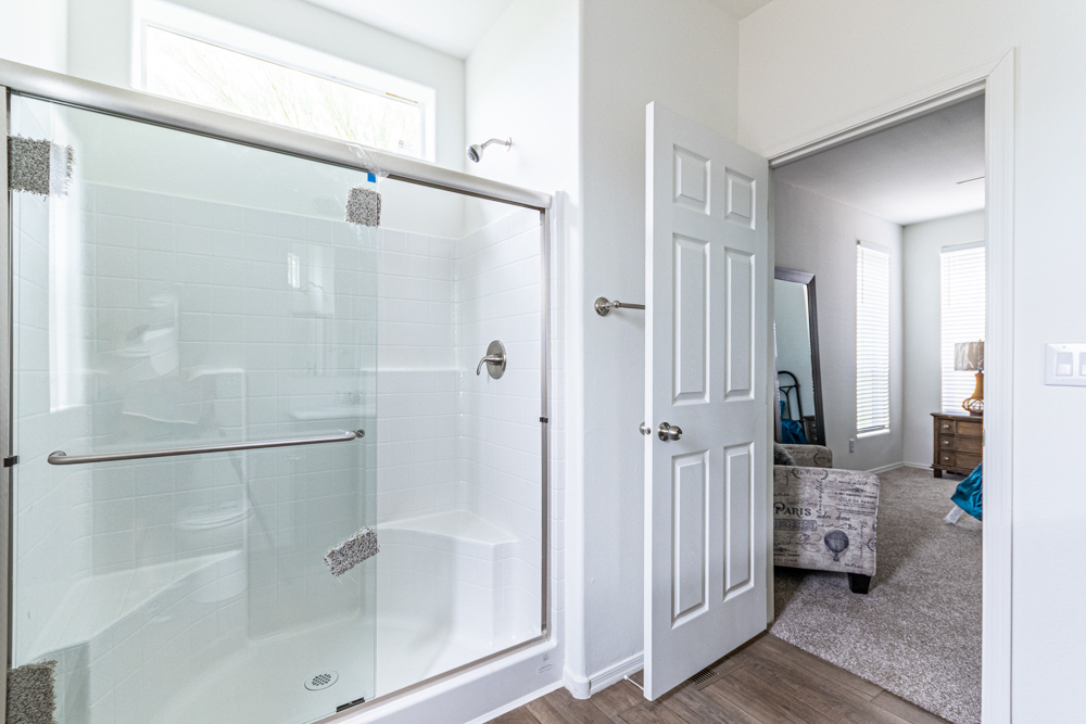 - Fiberglass Shower Stall with Glass Enclosure in Master Bathroom